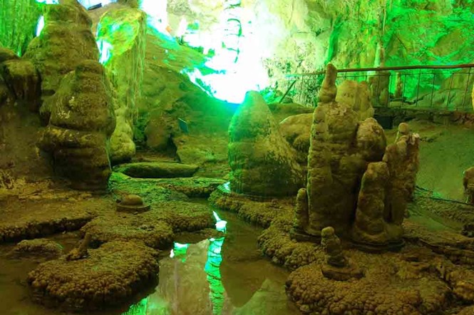 到溶洞進(jìn)口,通過(guò)長(zhǎng)30米,高2.5米的人工隧道,便進(jìn)入第一景區(qū)玉柱潭,洞頂最高處距地面49米,可同時(shí)容納500余人。景區(qū)內(nèi)石筍、石柱密布,高低粗細(xì)不等,是洞內(nèi)石筍、石柱最集中的一個(gè)景區(qū),又因其間有一潭清澈的地下池水,所以景區(qū)得名“玉柱潭”。