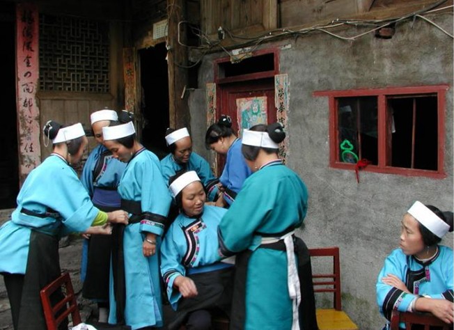 在服飾方面,屯堡婦女保持祖制,依舊是寶藍(lán)色的長(zhǎng)衣大袖,精致的花邊體現(xiàn)了江南刺繡的神韻;一雙尖頭的繡花鞋,透著屯堡婦女的才思,典雅而高貴。屯堡婦女的服飾已成為研究明代服飾的活資料。