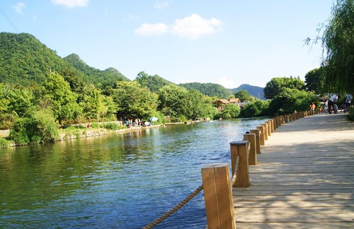 ?。?)螃蟹井—穆家壩河灘景觀:該景觀以彎曲河道水面為主體,其間具有賓館,螃蟹井、村寨、孤丘組景。該景觀的原始風(fēng)貌獨(dú)具一格,河水碧綠迂回,兩岸秀山并列,山澗螃蟹井水流涓涓,農(nóng)田稻花滾滾,苗圃翠新,大有“穿花復(fù)繞水,隔岸聞花香”風(fēng)光。版權(quán)所有山東聊城聊之旅國(guó)際旅行社有限公司,轉(zhuǎn)載必究!在吉林賓館一帶。更是綠樹成蔭,草坪蔥蔥,姐妹峰則是古藤繞崖,螃蟹井布依農(nóng)舍更反映了布依山寨特色。