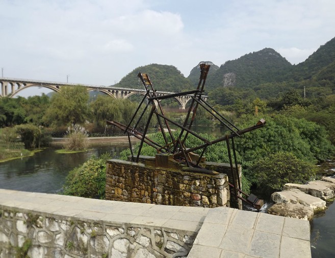 (2)上水河灘景觀:該景觀由蛇狀河曲、河牛2個(gè)小島及1個(gè)大島、水輾、小橋、上水村寨、孤丘組成。河曲竹木夾巖,綠島相間,上水村依山面水,孤丘(比高40米)屹立河畔,其襯景、對(duì)景效果好。