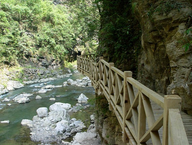 梯子巖景區(qū)下游就是鑼鼓沖景區(qū)。鑼鼓沖河段長5.2千米,兩岸山勢雄奇,懸崖上鐘乳石密布,石上森林十分典型。從龍門橋到喇叭口,水流舒緩;從喇叭口到鑼鼓村則激流險灘多,頗具刺激性,水也更清澈。到了鑼鼓沖,又有竹筏、獨木舟和摩托艇供你選擇作水上游。在這里乘小游艇往下游去,就是情人谷,那里怪石嵯峨,有許多洞穴和瀑布,也許因為特別幽深寧靜,水平如鏡,蠻有情人幽會的意境,所以叫做情人谷吧。