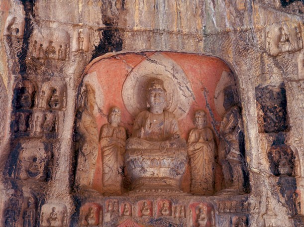 賓陽(yáng)洞包括南洞、中洞和北洞,是北魏宣武帝為其父母孝文帝和文昭皇太后做功德所營(yíng)造的洞窟之一。版權(quán)所有山東聊城聊之旅國(guó)際旅行社有限公司,轉(zhuǎn)載必究!其中僅中洞的開(kāi)鑿就花費(fèi)了24年時(shí)間,其富麗堂皇的景象是龍門(mén)眾多石窟之冠。主佛釋迦牟尼端坐中央,面部修長(zhǎng)清秀,面容和藹慈祥,略帶微笑。迦葉、阿難二弟子和文殊、普賢二菩薩侍立左右。迦葉形象老成持重,阿難形象活潑開(kāi)朗,望之栩栩如生。佛像的衣飾都由北魏早期的袒露右肩和通肩式,變?yōu)榘虏剑切⑽牡蹖?shí)行漢化政策在石刻藝術(shù)上的反映。洞頂?shù)裼猩徎▽毶w,周?chē)裰h逸脫俗的伎樂(lè)天人和供養(yǎng)天人。洞口內(nèi)壁兩側(cè)原本刻有三層大型浮雕,下層是著名的“皇帝禮佛圖”和“皇后禮佛圖”,構(gòu)圖嚴(yán)謹(jǐn),雕刻精美,是我國(guó)古代雕刻藝術(shù)的杰作??上н@兩幅珍品已于1934年被不法奸商盜往海外。后人已無(wú)緣得見(jiàn),只能對(duì)著石壁而徒發(fā)感慨了。