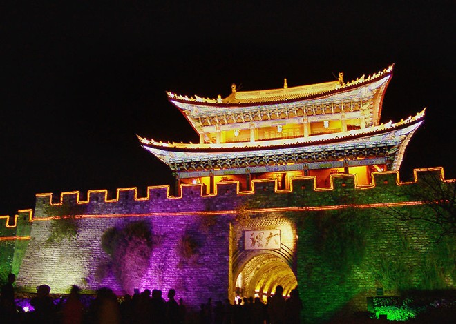 大理古城簡稱葉榆,又稱紫城,其歷史可追溯至唐天寶年間,南詔王閣邏鳳筑的羊苴咩城(今城之西三塔附近),為其新都。現(xiàn)在的古城始建于明洪武十五年(公元1382年),方圓十二里,城墻高二丈五尺,厚二丈。東西南北各設一門,均有城樓,四角還有角樓。解放初,城墻均被拆毀。1982年,重修南城門,門頭“大理”二字是集郭沫若書法而成。 由南城門進城,一條直通北門的復興路,成了繁華的街市,沿街店鋪比肩而設,出售大理石、扎染等民族工藝品及珠寶玉石。街巷間一些老宅,也仍可尋昔日風貌,庭院里花木扶疏,鳥鳴聲聲,戶外溪渠流水淙淙。“三家一眼井,一戶幾盆花”的景象依然。古城內東西走向的護國路,被稱為“洋人街”。這里一家接一家的中西餐館、咖啡館、茶館及工藝品商店,招牌、廣告多用洋文書寫,吸著金發(fā)碧眼的“老外”,在這里流連忘返,尋找東方古韻,漸成一道別致的風景。