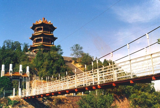 位于五龍峰東部約1.5公里處,主要游覽點(diǎn)有紫金閣、鐵索橋、牡丹園、月季園、植物園等。紫金閣分三層,高33米,每逢節(jié)日,紫金閣頂?shù)囊豢诤殓姂?yīng)和著黃河的波濤發(fā)出宏亮的聲響,聲聞數(shù)里。在岳山寺的懸崖峭壁之間架有一座鐵索橋,橋長40米,極為險峻。