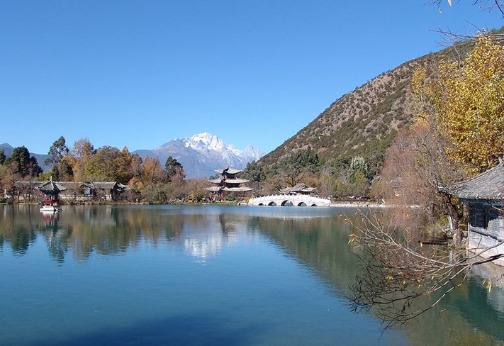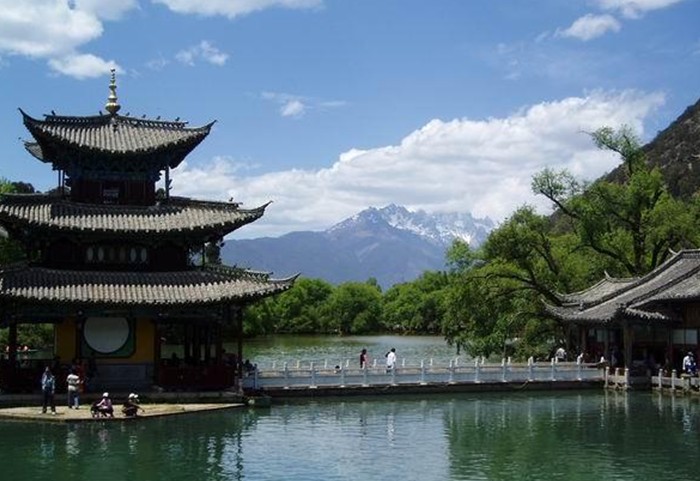 麗江黑龍?zhí)豆珗@俗稱龍王廟,位于麗江古城北端象山之麓。黑龍?zhí)秲?nèi)隨勢錯落的古建筑有龍神祠、得月樓、鎖翠橋、玉皇閣和后來遷建于此的原明代芝山福國寺解脫林門樓、五鳳樓,原知府衙署的明代光碧樓及清代聽鸝榭、一文亭、文明坊等建筑。