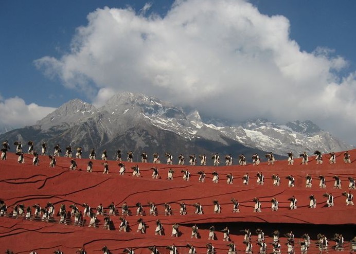 來自10個少數(shù)民族的鏗鏘漢子,來自16個鄉(xiāng)下村莊的普通農(nóng)民,500多個有著黝黑皮膚的非專業(yè)演員,用他們原生的動作,用他們質(zhì)樸的歌聲,用他們滾燙的汗水,與天地共舞,與自然同聲,帶給你心靈的震撼?!队∠?bull;雪山》大型實景演出克服了白天演出的諸多弊端,在經(jīng)過近百次的修改之后,終于將白天的劣勢轉為優(yōu)勢,讓每一個身臨其境的觀者都能真實地感受到一種從未體驗過的情感。演出全長1個小時,啟用了先進的造水工程和煙霧效果工程,與自然交相輝映,營造出令人贊嘆的視覺效果。