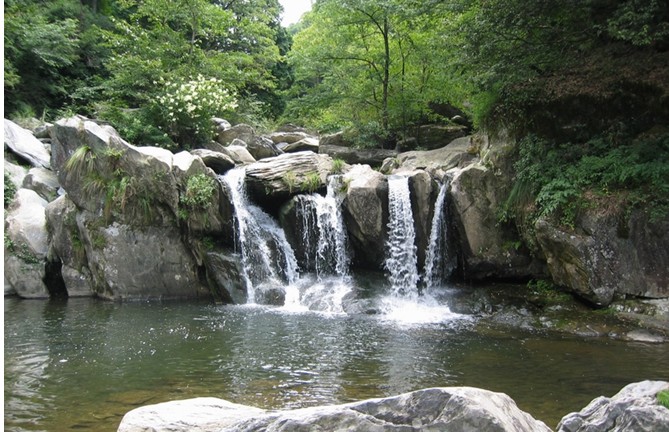 蓮花谷之南側(cè)便是王家坡雙瀑的位置所在。游人前往觀賞必須徒步攀登數(shù)里崎嶇山路,才能抵達(dá)王家坡雙瀑。初聞雙瀑之聲,已覺(jué)悠揚(yáng)悅耳,再觀雙瀑之景,更覺(jué)嫵媚可愛(ài)。翠竹綠林掩映之中的王家坡雙瀑,它不像匡廬之三疊泉瀑布、石門澗瀑布那么雄壯威風(fēng),氣勢(shì)磅礴,而像兩只比翼雙飛的戀鳥,雙雙跳躍在山澗之中,傾瀉在碧龍?zhí)独铩?/p>