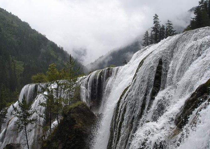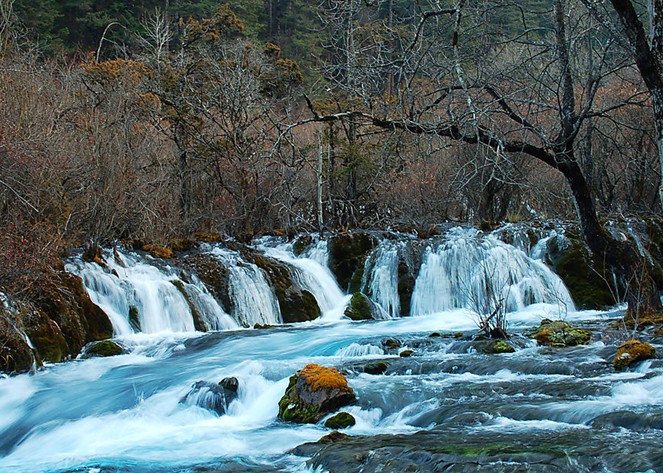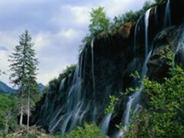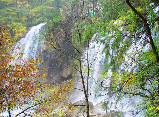 縱攬我國瀑布,或從斷崖驀然跌下,勢若大海倒瀉,銀河決口,聲勢恢宏;或從峭壁凌空飛落,狀如白綾脫軸、裊裊娜娜,姿態(tài)千般;或從洞上翻崖直下,形若水晶珠簾,垂掛洞前,妙趣橫生。而九寨溝瀑布群,則從長滿樹木的懸崖或灘上悄悄流出,瀑布往往被分成無數(shù)股細(xì)小的水流,或輕盈緩慢,或急流直瀉,千姿百態(tài),妙不可言,加上四周群山疊翠,滿目青蔥,至金秋時節(jié),層林盡染,瀑布之景就更為神奇秀麗了。