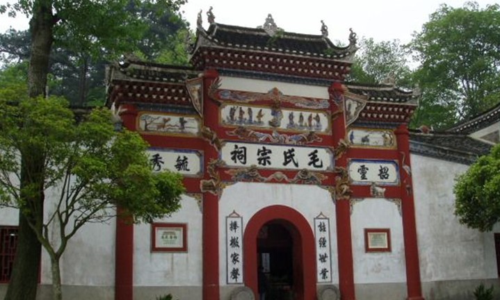毛氏宗祠是韶山毛氏家族的總祠堂,始建于1758年,1763年建成。建筑系磚木結(jié)構(gòu),青磚青瓦,建筑面積約700平方米。宗祠大門天頭有"毛氏宗祠"四字。大門外兩邊各立一石鼓。