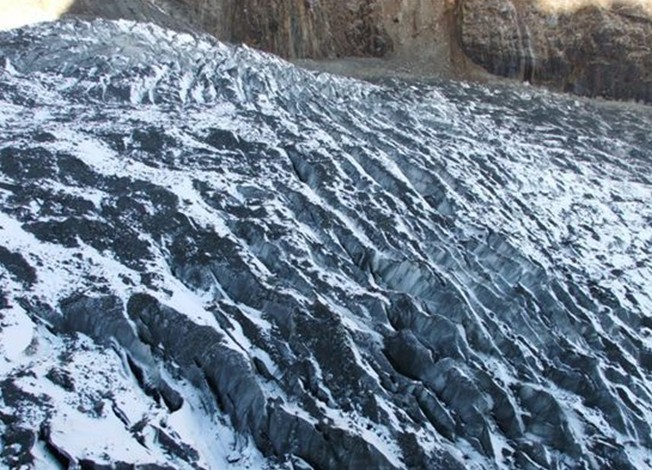 l號冰川從粒雪盆溢出后,沿盆前緣的冰床陡坡形成大冰瀑布。冰瀑上的冰川是一種超級伸張流,處于崩潰狀態(tài),頻繁發(fā)生冰崩與雪崩。隨著冰川的持續(xù)運動,冰瀑上的冰雪崩終年不斷。如果說粒雪盆是成冰與屯冰庫,則大冰瀑布如同冰川冰的粉碎機,而冰瀑坡腳則是新的冰川構(gòu)造鑄造場。