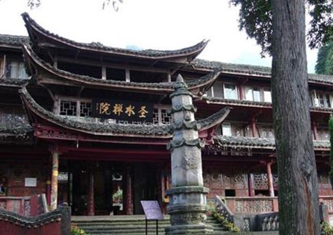 峨眉山圣水禪院原名神水庵、神水閣,有五重殿宇,全寺的殿堂和附屬房屋全系木制結(jié)構(gòu)。禪院原為明代安慶巡撫吳用先的舊居,因周圍“修竹萬竿”,有“水竹色相繞,碧花動(dòng)軒楹”(唐,孟郊 《旅次洛城東水亭》)的意境,取名“水竹居”。明萬歷末年(約公元1619年),因水竹居前有“玉液”神水,遂改宅為寺,名“神水庵”。寺院前有一塔,傳為隋代智者大師衣缽塔。