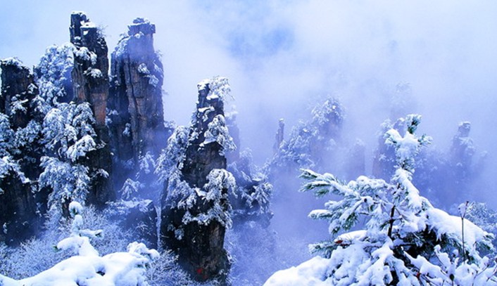 天子山還有云霧、月夜、霞日、冬雪四大奇觀。云霧,是天子山最多見(jiàn)的天象奇觀。有云霧、云海、云濤、云瀑和云彩等景象。久雨初晴之后或霏霏細(xì)雨之中,先是朦朧大霧,繼而形成白云,環(huán)繞飄浮。群峰在無(wú)邊無(wú)際的云海中時(shí)隱時(shí)現(xiàn),使人仿佛置身于蓬萊仙境之中。有時(shí)云霧從溪口涌出,爬過(guò)峰頂,然后以鋪天蓋地之勢(shì),飛瀉而下,形成云瀑,十分壯觀。月夜,當(dāng)月明星稀,萬(wàn)籟俱寂時(shí),這里的峰林被朦朧月色披上了一層“魔紗”,似一群群魔影聳立在幽谷之中。耳聞禽獸嚦嚦的叫聲,使人產(chǎn)生一種神秘感。霞日,晴天的早晨,一輪紅日在朵朵紅云的襯托下,從奇山異峰中冉冉升起。千萬(wàn)座石塔,婷婷玉立,披上一層紅霞,十分迷人。冬雪,入冬,天子山銀裝素裹,青松和峰頂被大雪覆蓋。此時(shí)的天子山冰柱倒立,冰花四散,只有一些山鹿、野豬,才不為銀白世界所征服。