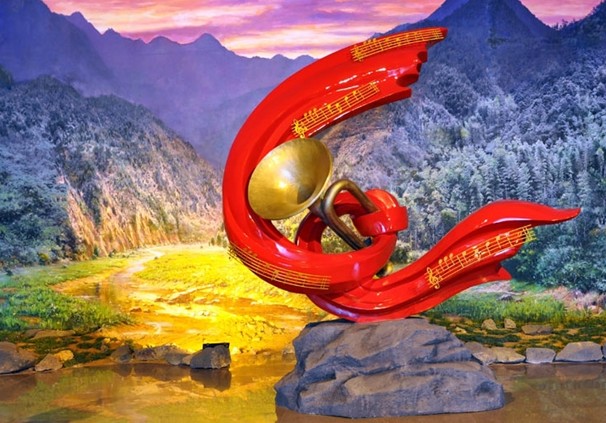 走進(jìn)新館,映入眼簾的是一個(gè)面積600平米,高9米的展覽序廳,最引人注目的是氣勢(shì)如虹的主題背景。據(jù)悉,背景油畫由清華美院師生集體創(chuàng)作,面積為600平方米,為我國目前最大的油畫。序廳是一個(gè)由巨幅油畫、主題圓雕和實(shí)體山景組合而成的大型多媒體景觀,主題鮮明,氣勢(shì)恢弘。
