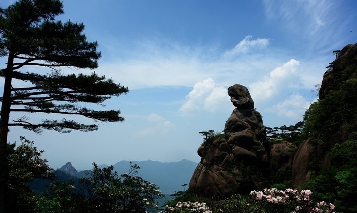 東方女神位于南清園東北部,三清山標志性景觀。海拔1180余米,通高86米。整座山體造型就像一位秀發(fā)披肩的少女,天地造化,鬼斧神工。億萬年來,女神端坐山峰,默然注視蕓蕓眾生,神態(tài)祥和。傳說女神為西王母第二十三女,名瑤姬。世人認為她是春天的化身,因而又稱之為“東方女神”。