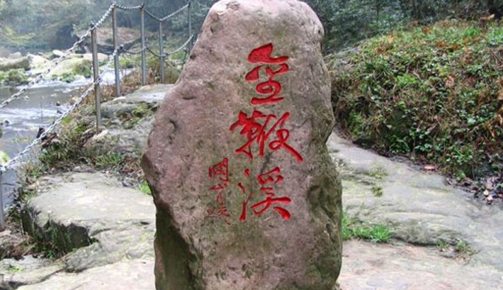 4、醉羅漢:與金鞭巖隔溪對(duì)峙,矗立在斜坡上,高200余米。 上下一般粗壯,峰體渾圓,色赤,整座石峰向金鞭溪呈70度傾斜,形似一醉酒羅漢,欲倒不倒,似醉非醉,詼諧幽默,發(fā)人情趣。自峰下向上仰望,但覺云移峰晃,感覺隨時(shí)都要崩塌之感。 清嘉慶年間學(xué)士彭之 臣在峰壁書寫一“忠”字。清道光四年(1824),貢生彭之運(yùn)作《壁忠記》一文以彰其勝。風(fēng)雨滄桑,“忠”字因山石崩塌遭毀。
