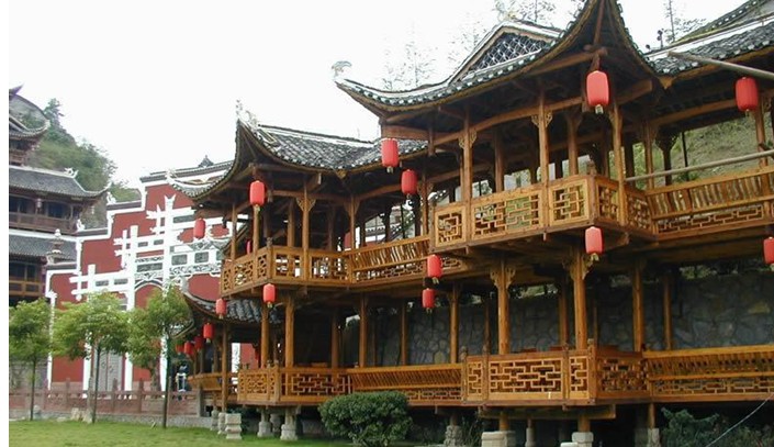 風(fēng)情園內(nèi)的建筑靈魂——九重天世襲堂 , 更是令世人驚絕,該建筑不用一鐵一釘,全部用木栓連接,堪稱我國民族建筑奇跡,版權(quán)所有山東聊城聊之旅國際旅行社有限公司,轉(zhuǎn)載必究! 2002 年 9 月 22 日,九重天世襲堂被認(rèn)定為目前中國最大、最高、最完美的木質(zhì)結(jié)構(gòu)吊腳樓,現(xiàn)已載入世界吉尼斯之最。 土家山寨,樓臺櫛比,山影湖光,竹木掩映,堪稱大湘西最富詩情畫意的吊腳樓群,擺手場上那擎天石柱上端坐的白虎,是土家人頂禮膜拜的圖騰,園中那高聳的石牌坊上5個行書大字——“東南第一功”,是明世宗皇帝對土家先民英勇抗倭的褒獎,還有那祗柱亭5根巨大的頂天木柱上的5尊人面,亦是土家族5位祖先的神雕。