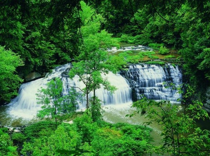 崖旁三峰突起,比肩兀立,水從左峽奪路而出,從46米高的崖頭跌下深潭,然后繼續(xù)奔涌向前。這里,河水仿佛被疊為二折,故俗稱疊水河瀑布。