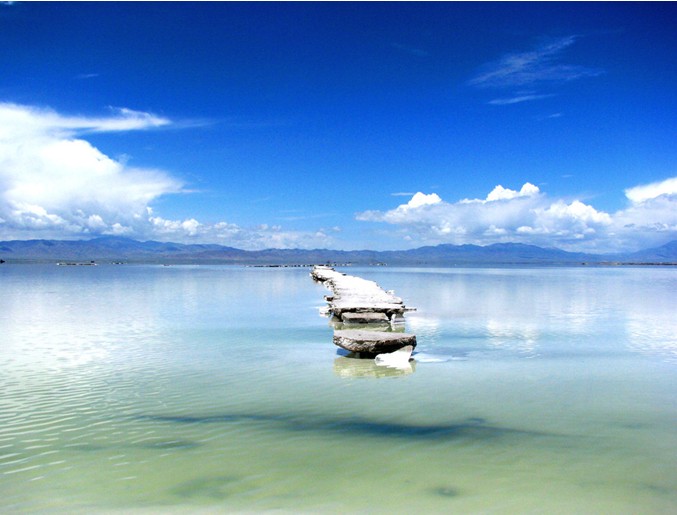 茶卡鹽湖與其它鹽湖不同的是,茶卡鹽湖是固液并存的鹵水湖,鑲嵌在雪山草地間而非戈壁沙漠上。鹽湖水域?qū)拸V,銀波粼粼。天空白云悠悠,遠(yuǎn)處蒼山崢嶸,藍(lán)天白云、雪山映入湖中,如詩如畫。四周牧草如茵,羊群似珍珠灑落。漫步湖上,猶如進(jìn)入鹽的世界。