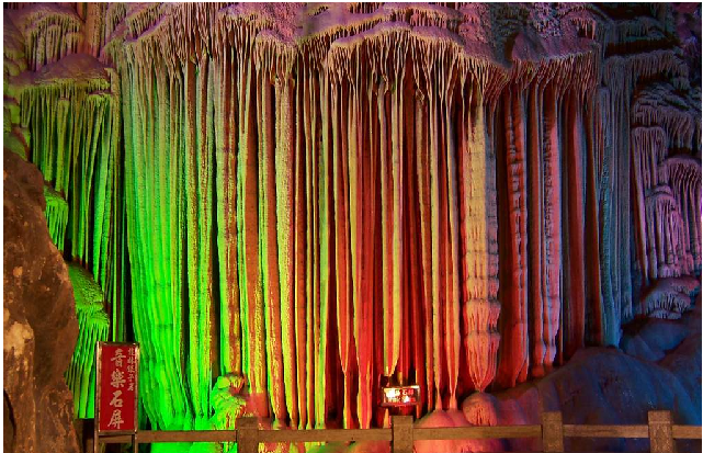 在桂林市西北7千米處的光明山上,因洞口長(zhǎng)有蘆荻草,其可制牧笛而命名。蘆笛巖是一個(gè)地下溶洞,深230米,長(zhǎng)約500米,最短處約90米,其游程雖比七星巖短,但景色卻比七星巖更奇。蘆笛巖內(nèi)鐘乳石,石筍、石柱、石幔,石花玲瓏多姿,景象萬(wàn)千,由此所組成的雄偉“宮殿”、高峻“山峰”、擎天“玉柱”、無(wú)邊“林海”無(wú)不雄奇瑰麗,耀眼奪目,因此蘆笛巖享有“天然藝術(shù)宮”之美稱,與七星巖并列為“桂林兩大奇洞”。蘆笛洞內(nèi)景點(diǎn)有獅嶺朝霞、石乳羅帳、青松翠柏、盤(pán)龍寶塔、云臺(tái)攬勝、簾外云山、原始森林、琉璃宮燈、遠(yuǎn)望山城、幽景留聽(tīng)等。