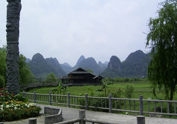 陽(yáng)朔“世外桃源”主要有荷花池、燕子湖、燕子洞、侗鄉(xiāng)風(fēng)情和原始部落組成。若是“沾衣欲濕杏花雨,吹面不寒楊柳風(fēng)”的季節(jié).踏進(jìn)“世外桃源”,展現(xiàn)在眼前的將是一片秀美的山水田園風(fēng)光。清波蕩漾的燕子湖鑲嵌在大片的綠野平疇之中,宛如少女的明眸脈脈含情。湖岸邊垂柳依依,輕拂水面。一架巨大的水轉(zhuǎn)筒車,吱吱呀呀地?fù)u著歲月,也吟唱鄉(xiāng)村古老的歌謠。放眼望去,遠(yuǎn)方群山,村樹含煙,阡陌縱橫,屋宇錯(cuò)落,宛若陶淵明筆下“芳草鮮美,落英繽紛”“有良田美池桑竹之屬”的桃源畫境。