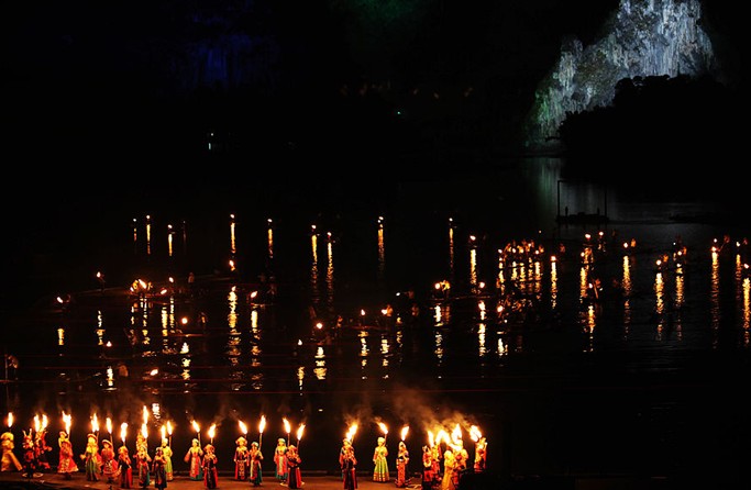 世界上最大的山水實(shí)景劇場(chǎng),全球最具魅力的導(dǎo)演,傳唱最久遠(yuǎn)的民族山歌,史無(wú)前例的桂林漓江風(fēng)情巨獻(xiàn)。大型桂林山水實(shí)景演出《印象劉三姐》是錦繡漓江-劉三姐歌圩景區(qū)之核心工程,由桂林廣維文華旅游文化產(chǎn)業(yè)有限公司投資建設(shè)、我國(guó)著名導(dǎo)演張藝謀出任總導(dǎo)演,國(guó)家一級(jí)編劇梅帥元任總策劃、制作人,以及兩位年輕導(dǎo)演--王潮歌、樊躍的加盟,數(shù)易其稿,歷時(shí)三年半努力制作而成。她集漓江山水風(fēng)情、廣西少數(shù)民族文化及中國(guó)精英藝術(shù)家創(chuàng)作之大成,是全世界第一部全新概念的"山水實(shí)景演出"。演出集唯一性、藝術(shù)性、震撼性、民族性、視覺(jué)性于一身,是一次演出的革命、一次視覺(jué)的革命。