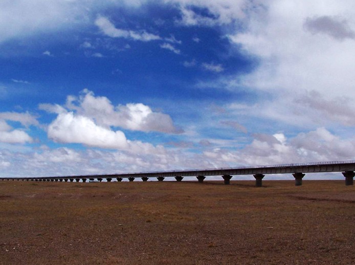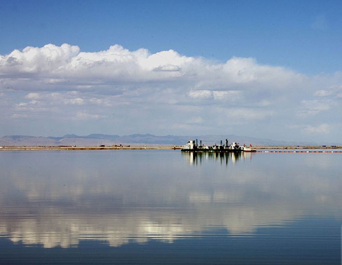 萬丈鹽橋道寬路長(zhǎng),風(fēng)光無限。人們乘車來到這里,只見筆直坦蕩的路橋,象一把利劍將浩瀚的鹽湖一劈兩半。鹽橋兩旁有鉀肥廠的廠房,宿舍,有溝壑一般的采礦點(diǎn),不遠(yuǎn)處還有舉世聞名的青藏鐵路,一列列長(zhǎng)蛇似的火車,吞云吐霧,鳴鳴吼叫著從湖面上飛馳而過。