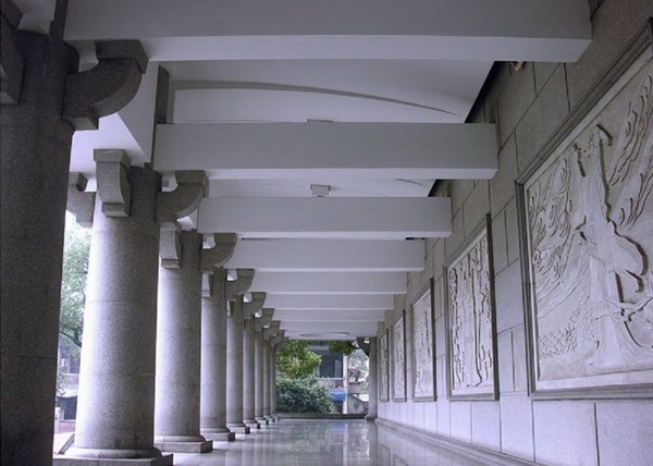 新館用融合的方法處理新舊建筑的關(guān)系,以原陳列大樓為中心,圍合前庭,強化兩翼,對稱布局,形成三殿式建筑,集簡練、穩(wěn)重、統(tǒng)一于一體,秩序感極強。