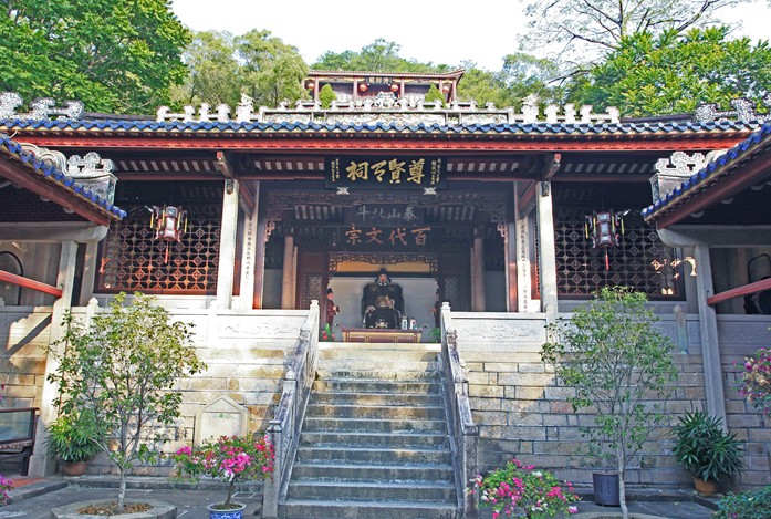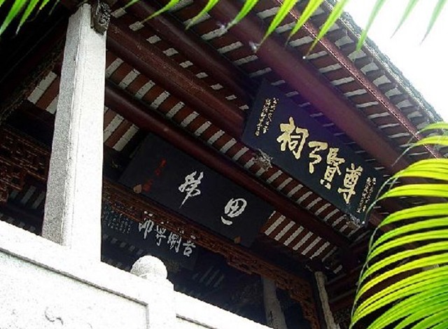 祠堂前廣場有一座古書形的石雕,上面刻寫了韓文公在《進(jìn)學(xué)解》中的兩句名言:“業(yè)精于勤荒于嬉,行成于思?xì)в陔S?!币馑际钦f:勤奮是事業(yè)精進(jìn)的前提,深思是行為成功的保證。韓祠正門,上面寫著“韓文公祠”四字,是1984年胡耀邦總書記視察潮州所留下的手跡。韓祠依山而建,層次分明,前落是韓祠的主體,后落是侍郎閣,現(xiàn)在我們拾級(jí)而上,石階一共有51級(jí),是紀(jì)念韓愈51歲時(shí)到潮州。
