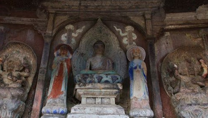 此窟為當(dāng)?shù)厝藦埵蠟樵旄6?,屬平民資助,造像簡(jiǎn)單技巧拙樸。釋迦佛坐蓮花座,雙盤腳,左手在腹前結(jié)定印,右手觸地降魔印,此造型流行于密教。彌勒菩薩在武周時(shí)代被武則天運(yùn)用于政治意義上,武后自稱彌勒下生,偽造《大云經(jīng)》 ,以宗教為奪權(quán)工具,在各地普造彌勒佛像,彌勒一改菩薩造型成為如來(lái)身。此窟彌勒佛雙腳立地倚坐,結(jié)說(shuō)法印,和中原的彌勒佛同造型。