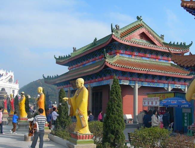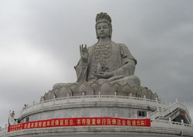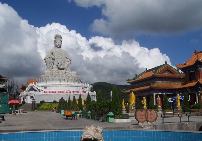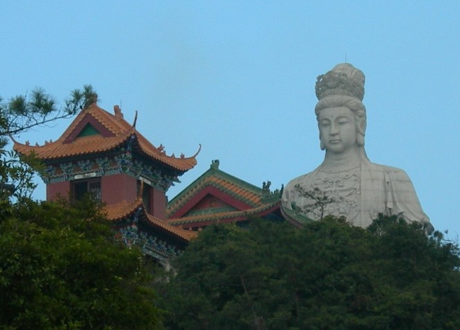 觀音廣場位于488米的觀音山頂,占地面積10000平方米,視野開闊,花繁葉茂,空氣清新,四季宜人。觀音菩薩圣像,就是目前全國乃至全世界最大的花崗巖觀音菩薩雕像。這尊觀音菩薩的圣像主題高33米,橫截面寬10.2米,體積有630立方米,總重3300噸,是由999塊0.5至8噸不等的福建蒲田優(yōu)質(zhì)花崗巖拼裝而成。圣像由國家一級雕塑師陳寶如設(shè)計,全部采用人工雕鑿,從1997年9月動工,至2001年6月竣工,歷時四年,總工日達98600個。