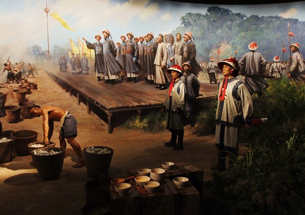 該館的陳列形式突破了傳統(tǒng)的陳列手法,注意把文物放在一定的環(huán)境氣氛中去展出,采取畫物結(jié)合,實物與輔助展品結(jié)合,采用場景、沙盤、聲光電模型、尋像放映等多種手段,使陳列形式生動、形象。如該館為了反映當(dāng)年林則徐、關(guān)天培用木排鐵鏈封鎖虎門??诘那樾?,把征集來的木錨及一艘早期的劃船送上展廳,并復(fù)制了大木排鐵鏈,與長33米,高2.8 米的虎門??谛蝿荼尘爱嬒嘟Y(jié)合,版權(quán)所有山東聊城聊之旅國際旅行社有限公司,轉(zhuǎn)載必究!構(gòu)成了一幅氣勢磅礴,頗為壯觀的場景,形象地再現(xiàn)了當(dāng)年用木排鐵鏈封鎖虎門海口的形勢,大大增強(qiáng)了展覽的效果。