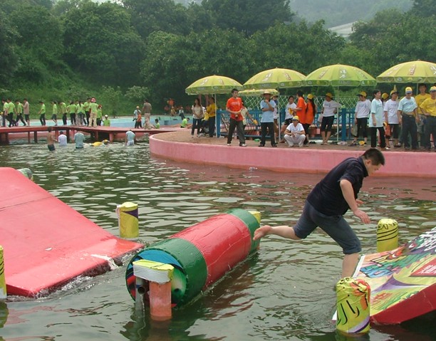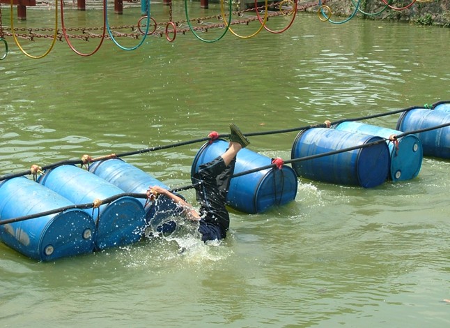參訓隊員必須從岸邊的起點,利用空中的長繩蕩到水面的兩個1平米的平臺上,一個平臺站滿人后再轉(zhuǎn)移到另一平臺上,每個平臺目前最多可站26人。訓練各級人員相互理解、互相包容,相互支持與緊密合作,打破隊員之間、男女之間、部門之間的隔閡,勇創(chuàng)佳績的決心和勇氣。