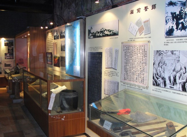 紀(jì)念館內(nèi)的展品主要有沙盤、七星旗、武器和戰(zhàn)利品。沙盤是當(dāng)年三元里及附近103鄉(xiāng)農(nóng)民抗擊英國侵略者斗爭的示意模型。它重現(xiàn)了當(dāng)年鄉(xiāng)民大敗英軍的場面與殺聲震天的情景,使我們?nèi)缗R其境,如聞其聲。這里“黑底牙邊三連星旗”曾是三元里抗英斗爭的指揮旗,英軍打仗忌黑旗,一見到這面旗就失色驚呼:“打死仗者來了!”頓時(shí)落魄驚魂,斗志盡失?,F(xiàn)在北京中國革命歷史博物館內(nèi)展出的三星戰(zhàn)旗是復(fù)制品,它和陳列在這里的大刀、長矛、繳獲的英軍軍服,以及陳列在大門兩邊的4門古炮,版權(quán)所有山東聊城聊之旅國際旅行社有限公司,轉(zhuǎn)載必究!被一代代保存下來,作為愛國主義教育的生動(dòng)教材,讓后人永遠(yuǎn)記取這段光輝的一個(gè)歷史。