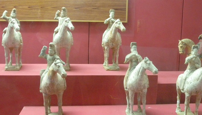 該館館藏文物4500多件,是研究初唐政治、經(jīng)濟、文化的寶貴實物資料。鄭仁泰、張士貴等墓出土的彩繪釉陶俑,是唐三彩的前身。李貞、安元壽等墓出土的唐三彩,雄渾斑爛,雍容華貴。李勣墓出土的“三梁進德冠”,是中國目前發(fā)現(xiàn)的最古的一頂進德冠。諸多陪葬墓出土的神態(tài)各異的胡俑和駱駝俑,反映了初唐時期絲綢之路的盛況,體現(xiàn)著初唐時期中國各民族的大融合。