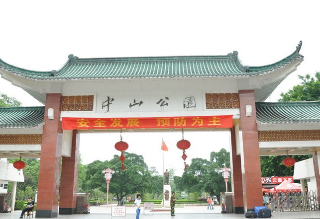 韶關(guān)市中山公園位于市中心區(qū),湞江、武江、北江交匯處,總面積約12公頃。公園以中心大道為主軸線,形成了近三萬平方米開闊的公園城市廣場(chǎng)。主軸線上建有古典大屋頂琉璃瓦大門,孫中山雕像,音樂噴泉及文藝演出舞臺(tái)等建筑。廣場(chǎng)最高游人容量可達(dá)2萬多人。公園沿周邊規(guī)劃了兒童活動(dòng)區(qū)、安靜休息區(qū)、盆景園、竹園以及水景區(qū)五個(gè)小區(qū)。
