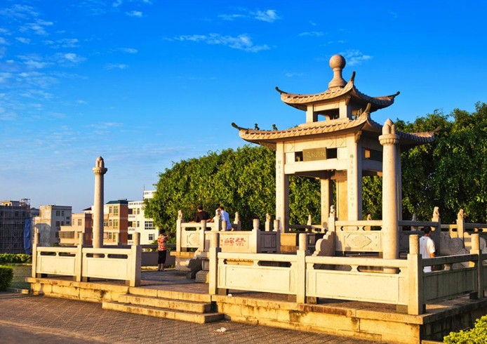 今在古渡口堤上建有祭鱷亭,整座亭用花崗巖石建造,雙層四柱,回廊欄桿,端莊且典雅。亭內(nèi)設(shè)祭鱷臺,題書“鱷渡秋風”、“祭鱷臺”匾額。其中一聯(lián)日:“佛骨滴來嶺?;囟鲋?;鱷魚徙去江河自此澄清”。另一柱聯(lián)為:“溪石何嘗惡;江山喜姓韓”。亭中有一條栩栩如生的石鱷魚,脊背上堅載大石碑,正面刻韓愈《祭鱷魚文》全文,背面刻(鱷渡亭碑記》。