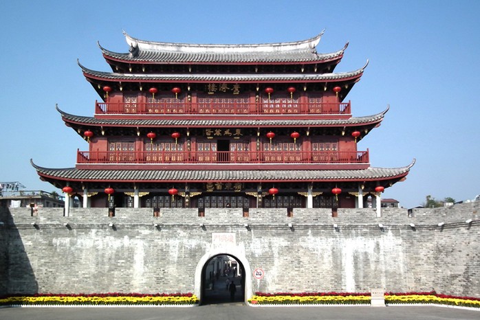廣濟門城樓是一座宮殿式三層歇山頂閣樓,外城門原有“東為萬春”門額。樓置于高大厚實的臺基上,拱門中開,面闊七間,進深五間,前后面為木石柱相銜接支撐,并跨出城墻外,成為騎樓。城樓為仿宮殿式建筑,重檐歇山頂,配以玻璃瓦紅彤壁,朱柱格子窗,畫棟雕梁,顯得雄偉壯觀。城樓中開拱門,高3.62米,寬2.9米。三樓懸巨型銅鐘1座,鑄于南宋紹興四年(1134)。原置于馬王廟,廟廢,遂移此。廣濟門大江前橫,長橋當(dāng)戶,扼守閩贛交通要沖。沿廣濟門城樓南北兩側(cè),至今還有2000多米長的古城墻和竹木門、上水門、下水門3座古城樓。暮春三月,登樓眺望,韓江水漲,煙波浩渺,筆峰如畫,行船如梭,別有一番景致,故潮州內(nèi)八景有“東樓觀潮”之勝。