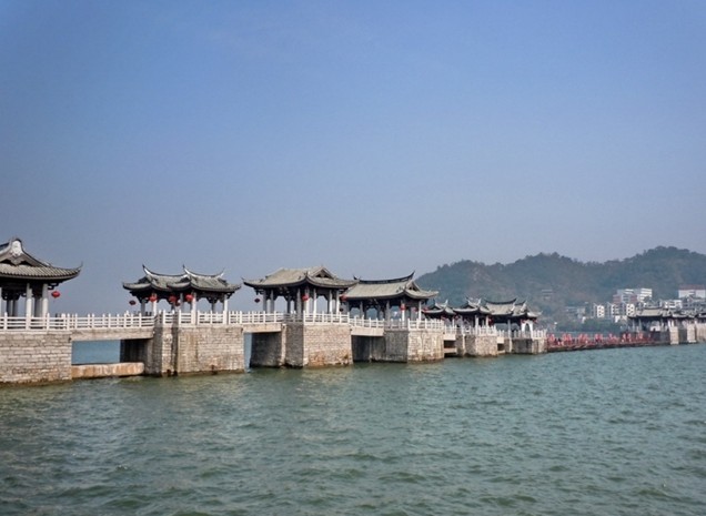 紹熙五年 (1194年),太守沈宗禹“皤石東岸”,筑“蓋秀亭”,并稱東橋?yàn)?lsquo;濟(jì)川橋’,接著,太守陳宏規(guī)、林驃、林會相繼增筑,至開禧二年(1206年)歷時十二年,建成橋墩十三座。東西橋建起來后,中間仍以浮舟連結(jié)之,形成了梁橋與浮橋相結(jié)合的基本格局。