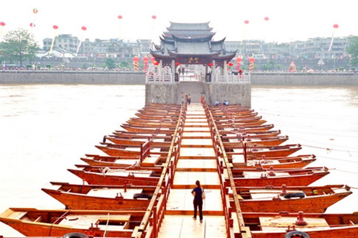 公元1171年 南宋乾道七年,知州曾汪,造舟為梁,舟八十有六只,以接江之東西岸,且峙石于中,以繩其勢,根其址,名曰“康濟(jì)橋”。