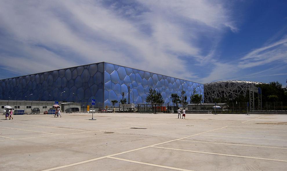 “水立方”與“鳥巢”只有一路之隔,一方一圓,一藍(lán)一紅,形成了一種微妙、均衡的關(guān)系。中方主設(shè)計(jì)師趙小鈞先生介紹說,就設(shè)計(jì)過程來說,是先有‘鳥巢’,所以,一開始做這個(gè)設(shè)計(jì),關(guān)于如何跟‘鳥巢’形成一個(gè)和諧的、統(tǒng)一的、對(duì)比的、互相映襯這樣一個(gè)關(guān)系,就是大家重點(diǎn)討論的一個(gè)方面。