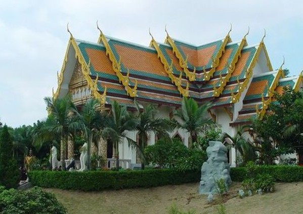 大殿總高19米,建筑面積490平方米。墻為白色,屋角、窗頂尖形,瓦似魚鱗并染青或黃色,屋檐頂端配有一支支向天的黃色裝飾圖案,新穎壯觀。內(nèi)部布置莊嚴(yán),有精美的壁畫《佛陀的故事》,但沒(méi)有中國(guó)通常的三如來(lái)或西方三圣,僅有一尊泰式跏跌坐式大型銅鑄佛陀圣像,連同蓮座高3米余,重1.5噸,金光閃閃,妙相莊嚴(yán)。東殿供奉一尊護(hù)法尊者(即四面佛)像。這位護(hù)法神,即是大梵天,本是婆羅門教,印度教的創(chuàng)造之神。