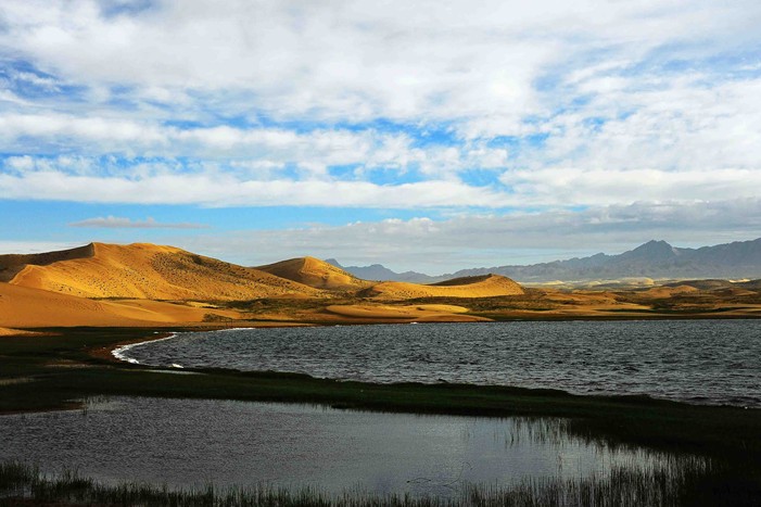 如今,相關(guān)部門在金子海開辟了旅游線路,讓游人滑沙、垂釣、戲水,觀賞高原荒漠的種種自然美景,在潔白蒙古包里品嘗奶茶、羊肉手抓,觀看蒙古族歌舞,了解和體驗民族風(fēng)情,這些都會把游人帶人淳樸、自然之中。金子海,比月牙泉更美的沙漠清泉,不愿你成為樓蘭古國的遺憾。版權(quán)所有山東聊城聊之旅國際旅行社有限公司,轉(zhuǎn)載必究!也有傳說牦牛山上下來一對金羊,在湖邊飲水,嘗到水味香醇甘甜,就不愿再回山而進入湖中,故稱該湖為金子海。海的西側(cè)、西北側(cè)、東側(cè)都被沙山環(huán)抱,沙質(zhì)是那般細膩,情不自禁讓人赤足,與其有更為親密的接觸。唯獨海的東南側(cè)是高高的蘆葦和近百米的草帶,吸引著鳥禽、牛羊覓食、嬉戲、休憩。水至清則無魚。由于金子海是由一眼甘甜的泉水日積月累而成,因此水極為清澈,淺水處不曾發(fā)現(xiàn)魚兒,版權(quán)所有山東聊城聊之旅國際旅行社有限公司,轉(zhuǎn)載必究!有的只是小海螺和小貝殼。其實,海的深處是有魚的??脊虐l(fā)現(xiàn)金子海的東邊是青銅器時代的文化堆積層,有石器和諾木洪文化夾砂褐陶罐殘片;說明,海的形成歷史悠久。在茫茫戈壁,有這樣一池甘甜的泉水養(yǎng)育著周圍的牧民,滋潤著這片土地上的一切生物,生生不息。