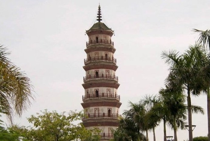 金鰲洲塔位于東莞市莞城西南1公里處,即萬江橋畔。因其座落于萬江金鰲洲,故名。金鰲洲古塔始建于明朝萬歷二十五年(1597年),合尖于天啟四年(1624年),歷時(shí)27年。據(jù)悉,建塔之目的為“以培風(fēng)氣,亦堪興家所宜也”。原為抗御水害的鎮(zhèn)水寶塔,8角10層,蓋頂有塔剎,無塔檐,無欄桿,磚牙疊砌。后于清乾隆二年(1737年)重建,塔基距水邊僅三、五米之遙,此塔處于江心陸洲,三面環(huán)水,經(jīng)二百五十多年,保存完整,基礎(chǔ)穩(wěn)固,巍然聳立于東江之濱。