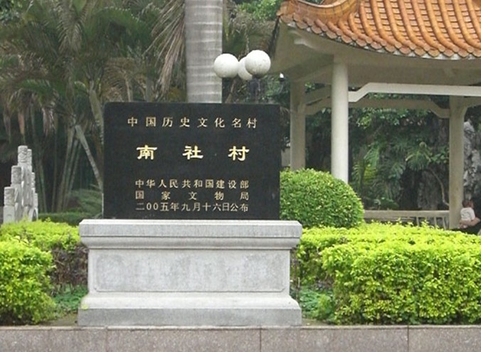 南社村莊四周綠樹成蔭,地理獨特,村莊呈合掌對居,明清期間初顯繁榮,為茶山一大村莊,很多專家稱贊:南社現(xiàn)存明清古建筑眾多,是珠江三角洲地區(qū)不可多得的完整的古村落,村內(nèi)尚保留宗祠、家廟25家、古民居120多間。