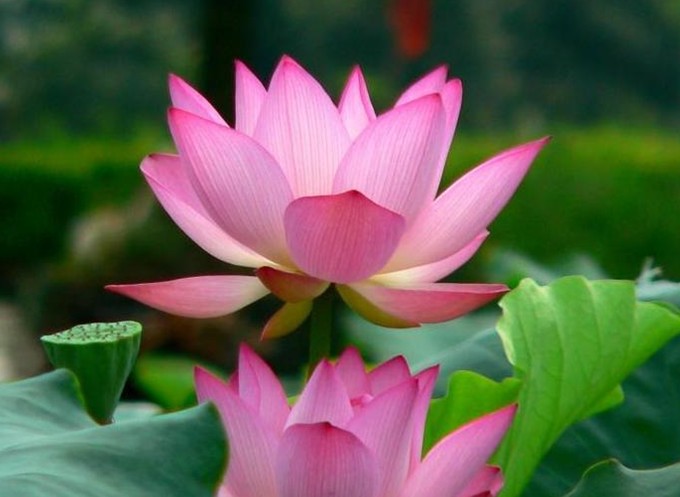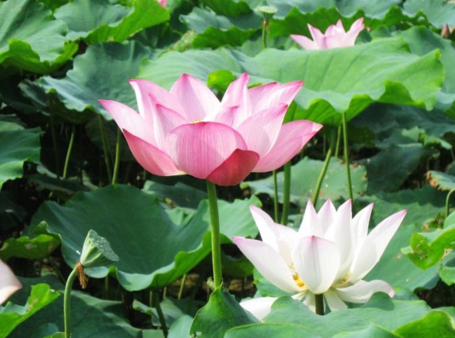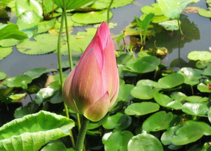 站在青石砌成的觀賞臺上,憑欄而觀,仿佛是綠波蕩漾中的一葉小舟,在此起彼伏的一片荷海中,隨波輕漂,粉霞點點,宛如天成的錦繡。怒放者有之,含苞者有之,傲然挺立者有之,含羞隱藏者有之,形態(tài)各異,各種風(fēng)姿盡收眼底。