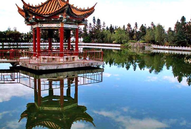 公園始建于80年代,建筑面積7畝,其中心是一泓近10多畝的水潭。池邊廣植銀樺、雪松、垂柳等,四周有藤架、大理石桌凳、大理石長(zhǎng)欄,小溪繞潭。水池西側(cè)有大理碑亭,過亭沿曲廊行數(shù)米,可達(dá)水中的漾波亭。版權(quán)所有山東聊城聊之旅國(guó)際旅行社有限公司,轉(zhuǎn)載必究!漾波亭南側(cè)有一小島,島上塑有一對(duì)栩栩如生白鶴,水中倒影,人動(dòng)影移與漾波亭相映成趣。
