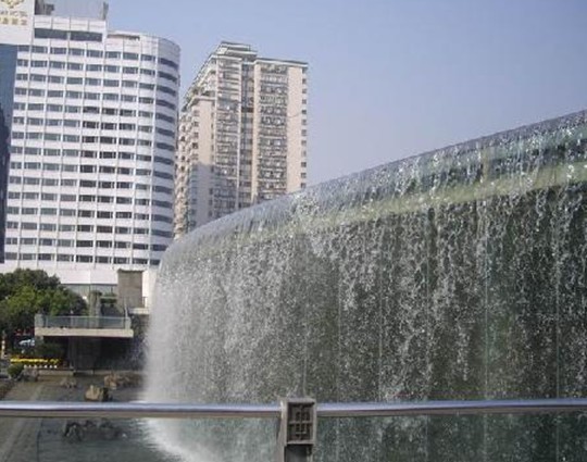 廣州火車東站及其廣場(chǎng)位于新城市中軸線的北段,東站綠化廣場(chǎng)以大面積的綠地營(yíng)造了一個(gè)大尺度的環(huán)境空間效果,配以精致的花壇、雕塑、水景,體現(xiàn)了廣州現(xiàn)代化國(guó)際城市的都市風(fēng)采。長(zhǎng)89米、高8米的玻璃墻構(gòu)成了水景瀑布的依托,流水從高平臺(tái)溢出,順玻璃墻瀉入水池,各色燈光不斷變幻將瀑布映得五顏六色。
