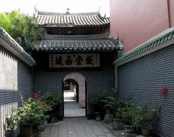 懷圣寺又名獅子寺,俗稱光塔寺,是中國(guó)四大古代清真寺之一,也是我國(guó)現(xiàn)存最古老的清真寺建筑。位于越秀區(qū)光塔路56號(hào),被列為廣東省省級(jí)重點(diǎn)文物保護(hù)單位。唐、來以來,廣州為我國(guó)海外貿(mào)易的主要港口,那時(shí)廣州的阿拉伯富商最多,他們?cè)诋?dāng)?shù)卣闹С窒?,修建了一座?guī)德宏大的清真寺,即今日的懷圣寺,寺的命名表達(dá)了中外教民對(duì)圣人穆罕默德的尊從和懷念。該寺禮拜大殿置于院庭的正面,它是3間帶周圍廊、歇山重檐綠琉璃,帶斗拱的古典式建筑,巍然聳立在帶雕石欄桿的大平臺(tái)上,充分顯示了大殿的高貴威嚴(yán)、石欄桿板上的雕刻各異,有葫蘆、扇子、傘蓋、花卉、獅子、游魚等物,極為活潑生動(dòng)。大殿內(nèi)部潔白明亮,用木地板及三面拉門,殿內(nèi)裝飾雖少,但很整潔大方。