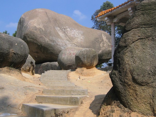 豬頭石高約5米,長6米,100余噸重,由兩小巨石頂住,仿佛凌空飛來,擱在石棱倒插的火爐山云峰山石之巔,版權(quán)所有山東聊城聊之旅國際旅行社有限公司,轉(zhuǎn)載必究!科學(xué)解釋為第四紀冰川過處的遺留物。