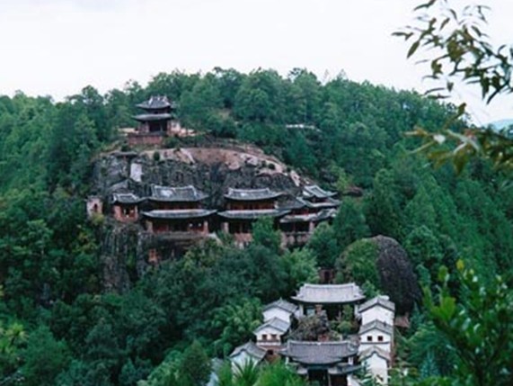石窟道觀寶相寺,位于佛頂山上,依山建筑在一堵高聳險(xiǎn)峻的大石崖上,下層是大殿,二殿為寺觀,鑿石抬梁,被譽(yù)為“云南的懸空寺”.